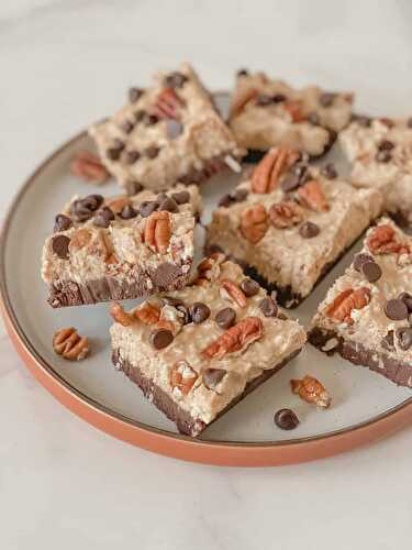 A no-bake dessert with chocolate base with a vanilla fudge topping studded with pecans and chocolate chips.
