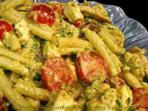 Pasta salad with whole-grain rotini pasta and chicken tossed with a homemade cilantro pesto sauce.