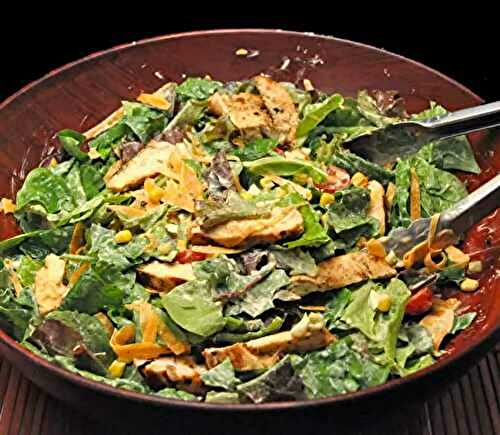 Chicken Salad, Yogurt Ranch Dressing, with shredded carrots, sweet corn, cherry tomatoes, and cheese - an easy one-dish dinner
