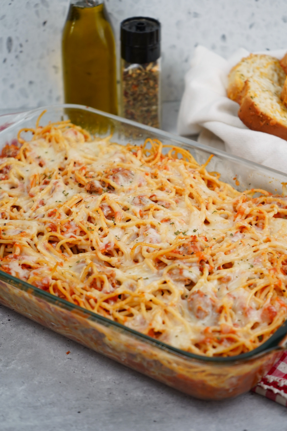 This tasty Italian Sausage Bake is an easy family casserole dinner made with pasta, spaghetti sauce, Italian sausage links, cheese, and basil! With only 5 ingredients, it's a super meal to put together quickly and still serve up a hearty comfort food.