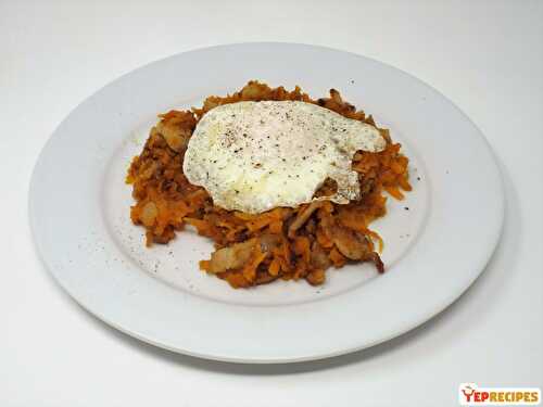 Shredded sweet potato, onions, and fresh pork side are cooked together and topped with an egg.