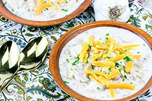 Warm up with this filling Creamy White Chicken Chili! An easy to make chicken chili recipe that is loaded with juicy bites of chicken, great northern beans, mild green chiles, garlic, cream cheese and more!