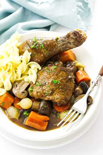 This classic chicken stew with red wine and mushrooms is made a little easier with the use of a slow cooker.