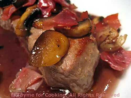 A French dish consisting of chicken pieces braised in red wine with pork belly, onions, and mushrooms.