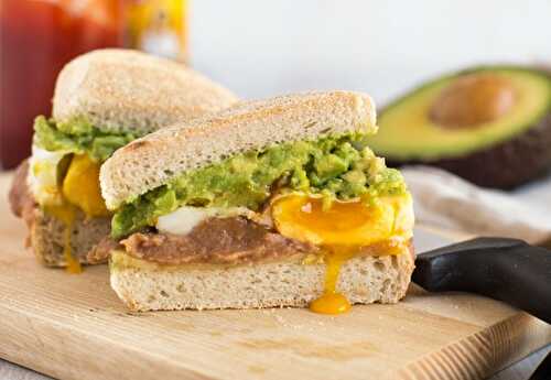 Tex Mex breakfast muffin - a new favourite! Fried egg, spicy refried beans, avocado, cheese, and a good dash of hot sauce - an amazing vegetarian breakfast.