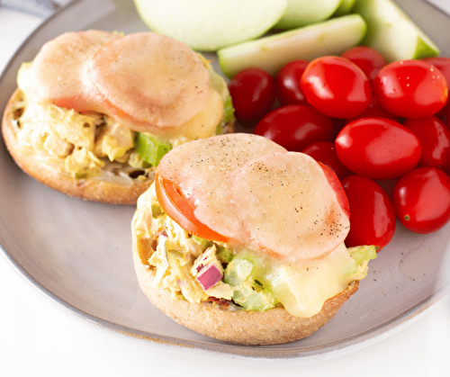 Easy and healthy open-faced tuna melts on English muffins! These tuna melts are creamy, crunchy, and every bit delicious as they are easy to make!