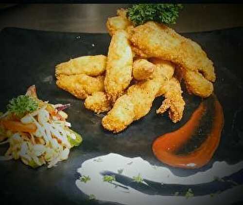 Finger size boneless fish pieces are marinated and coated with bread crumbs and deep fried till crisp golden.