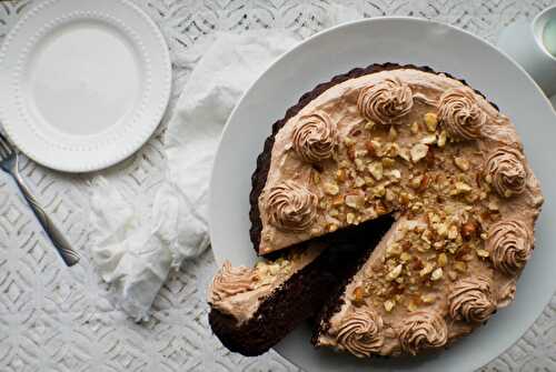 Low carb chocolate hazelnut cake is topped off with a light and fluffy chocolate hazelnut frosting.