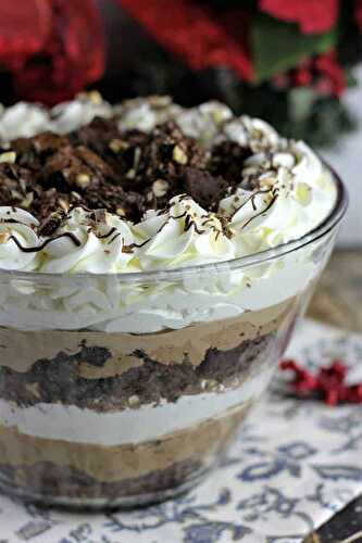 Divine layers of milk chocolate hazelnut brownies, rich chocolate hazelnut mousse, chopped bits of milk chocolate hazelnut bar with loads of hazelnuts and enticing dollops of sweetened whipped cream.