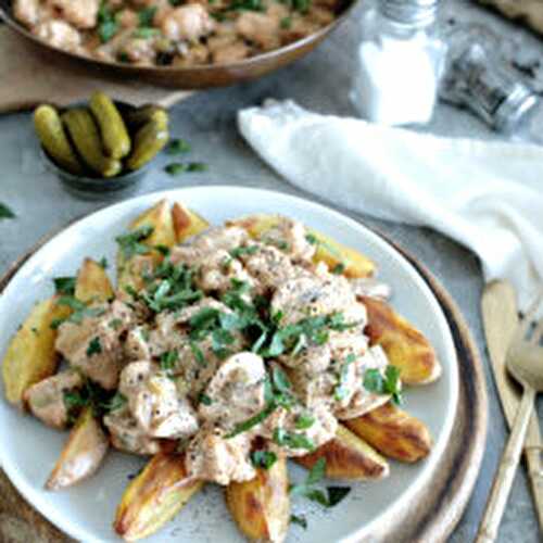 Vegan mushroom stroganoff with roasted potatoes is so good! It's creamy, savoury and loaded with delicious flavours, it's just the perfect comfort food.