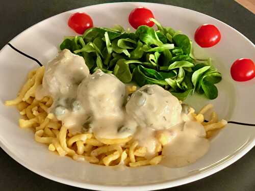 A German dish consisting of meatballs made of pork and beef simmered in broth and served with a creamy caper sauce.