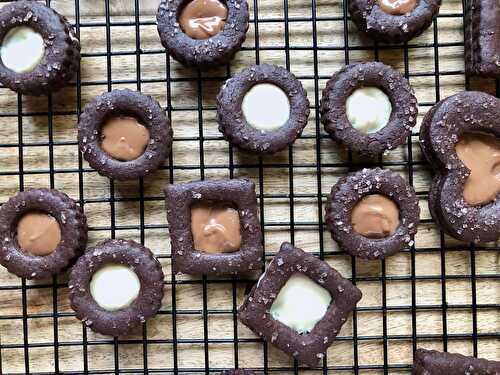 Adapted from Bon AppétitMelt tahini with chocolate in whatever shade you please for a glossy bittersweet filling that will sandwich together rich cocoa shortbreads.