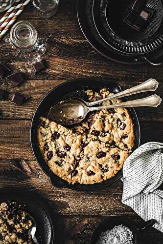 A combination of a soft chocolate chip cookie and a molten chocolate fondant - this chocolate chip cookie bake is so irresistibly gooey in the middle!