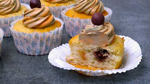 A cupcake with a velvet texture, red color, and of course a rich cream.