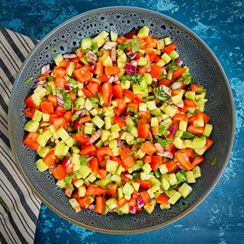 Kachumber or cachumber is a simple everyday Indian-style summer salad made with cucumber, tomatoes, and red onion.