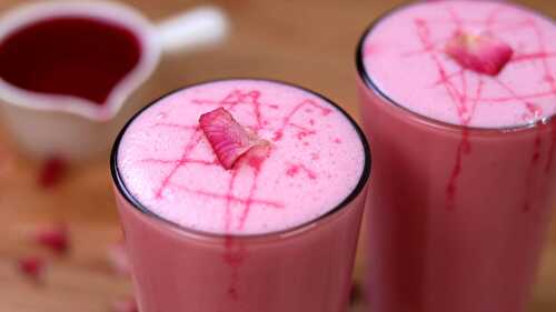 Rose lassi is a refreshing drink made with rose flavored syrup.
