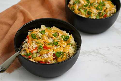 An easy Thai chicken and rice bowl with stir fried veggies and peanut sauce is the perfect mix of fresh, healthy, and comforting.