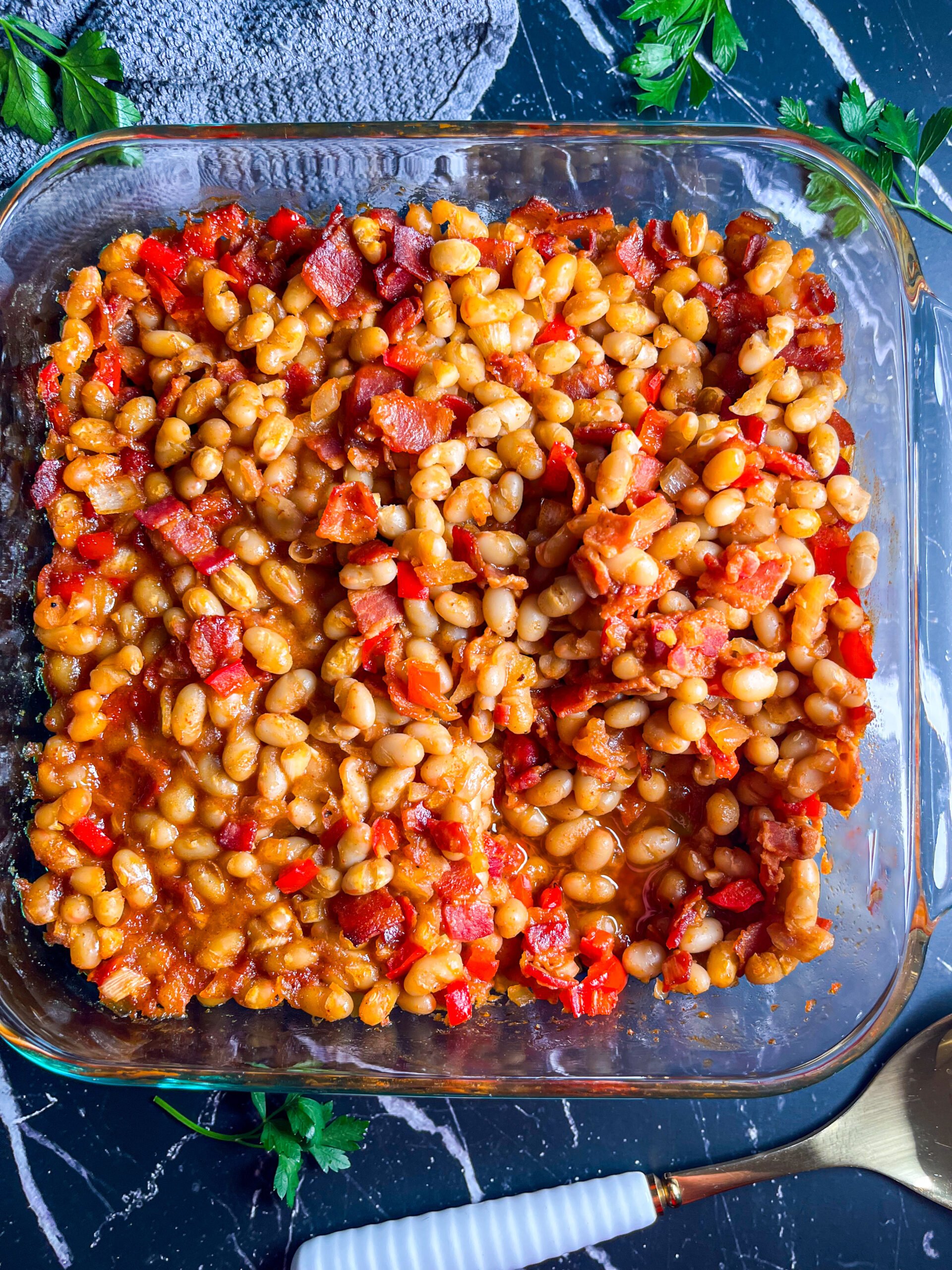 Enjoy the best homemade baked beans with bacon! This easy recipe features canned baked beans doctored up with BBQ sauce and a savory flavor from thick-cut bacon, smoked paprika, and more.