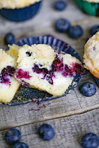These tantalizing Blueberry Cream Cheese Muffins are the dreamiest ever! Wait until you devour these moist, tender, ultra blueberry muffins filled with sweetened cream cheese topped with a cinnamon sugar crunch topping!