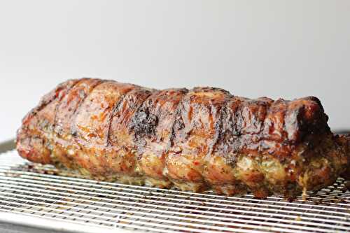 Boneless pork loin stuffed with an apple and sage stuffing and roasted in the oven.
