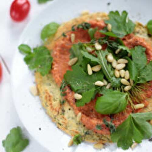 These vegan chickpea pancakes with sun-dried tomato sauce make a quick and healthy breakfast, lunch or dinner.