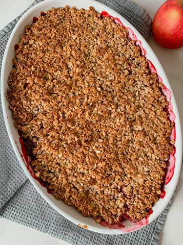 This apple and blackberry crumble recipe features freshly baked apples and blackberries with a hint of cinnamon, topped with a crisp oat crumble topping.