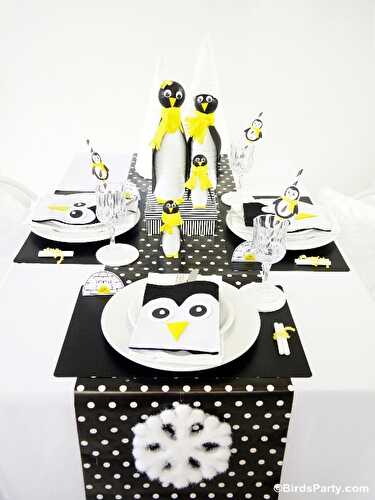 A Penguin Themed Kids Christmas Holiday Tablescape - black, white and yellow ideas on DIY decorations, printables, treats & table setting!