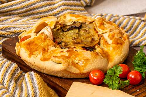 A delicious homemade rustic mediterranean vegetables pie that’s full of roasted vegetables roasted in the oven until golden brown.