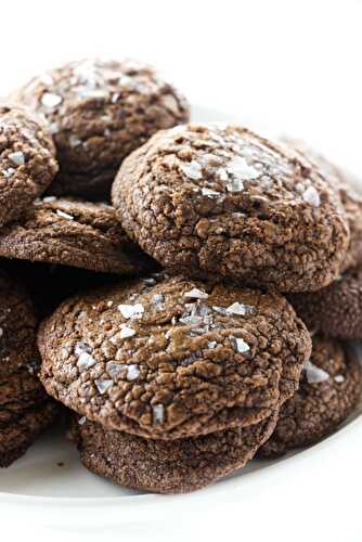 A recipe for salted chocolate fudge cookies made with dark chocolate and enhanced with a sprinkling of salt create a luxurious gourmet cookie.
