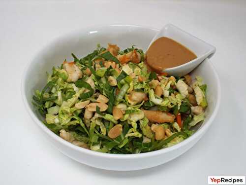An Asian inspired salad with chicken, carrots, brussels sprouts, bok choy, and chopped peanuts drizzled with a spicy peanut butter dressing.