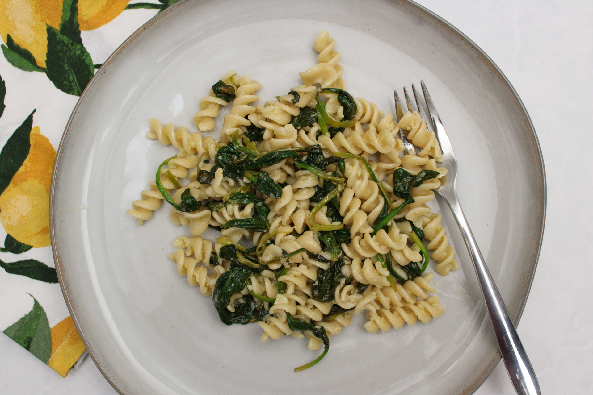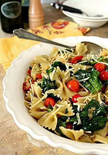 Simple and fresh pasta salad with spinach, tomatoes and roasted garlic.