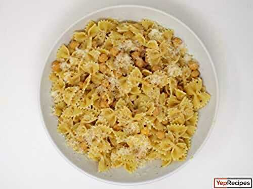 A simple pasta salad made with farfalle pasta, chickpeas, fresh garlic, and lemon juice then topped with freshly grated Parmesan cheese.