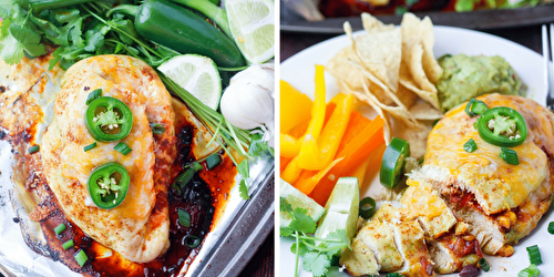 This sheet pan stuffed chicken is marinated in a mixture of spicy jalapenos, fresh cilantro, and succulent limes, then stuffed with salsa, topped with melty cheese, and baked to perfection.