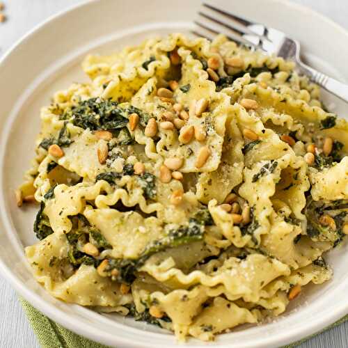 Mafalde pasta in a luxuriously glossy spinach and goat cheese sauce, topped with toasted pine nuts.