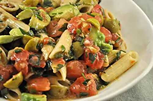 Pasta with an easy, no-cook sauce of fresh tomatoes, green olives, garlic and lots of fresh herbs.