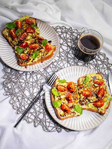 Smashed avocado, tomato on toasted bread then drizzling with tangy balsamic glaze.