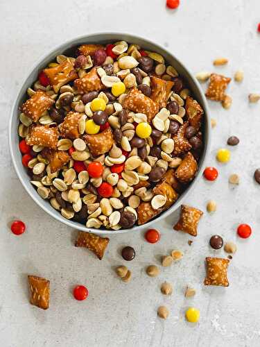 Peanut butter monster trail mix is full of peanut butter and crunch! Any peanut butter lover will be obsessed with this mix! Peanuts, pretzels, chocolate and raisins give you the perfect snack mix.