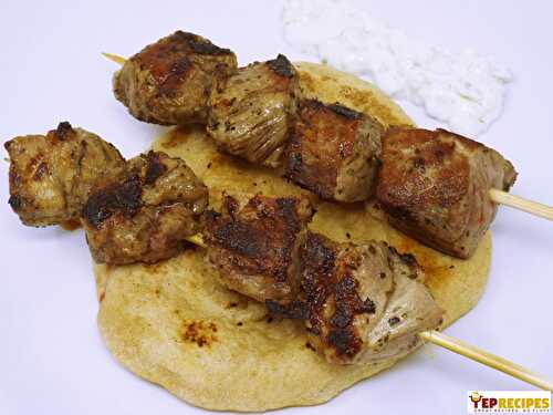 A popular Greek street food, marinated pork grilled on skewers served with pita bread and homemade tzatziki sauce.