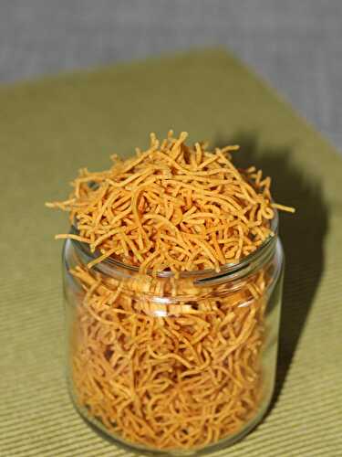 Potato sev is a crispy snack made with potato, gram flour and spices.