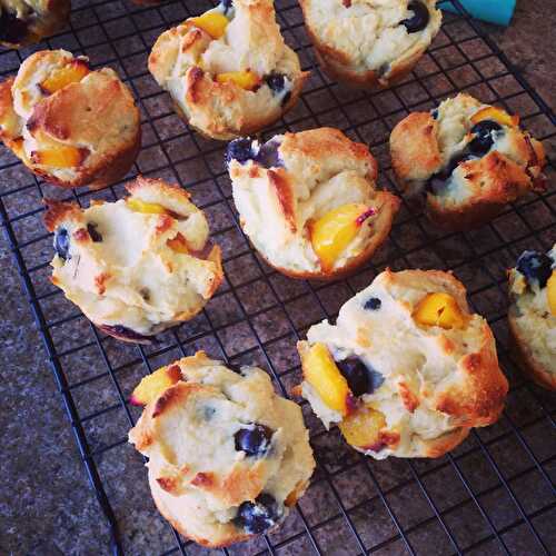 Slightly sweet and hearty lower carb muffins bursting with blueberries and peaches.
