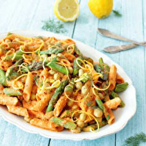 Lemony asparagus and lima bean pasta salad with creamy roasted bell pepper and almond sauce is a great vegan spring or summer meal.