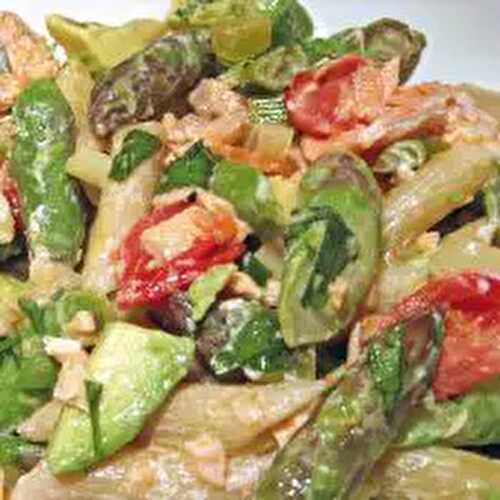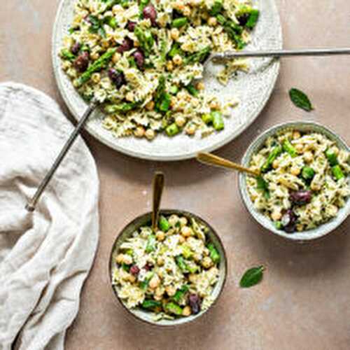 Spring Pasta Salad with asparagus, fresh herbs, olives, and chickpeas.