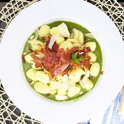 Smooth gnocchis on a smooth spinach sauce topped with crunchy cured ham, a perfect balance of textures and flavors.