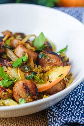 This healthy skillet with chicken sausage, brussels sprouts & apples can be made in less than 15 minutes.