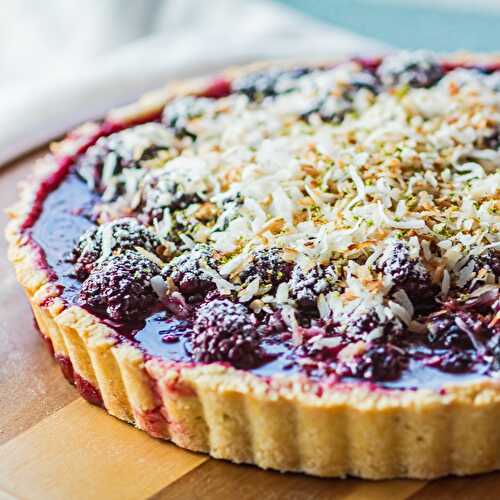 This easy to make Blackberry Tart is loaded with fresh blackberries in a shortcrust tart shell, and topped with toasted coconut and lime zest! The flavors come together to really highlight how delicious the fresh, plump blackberries are!!