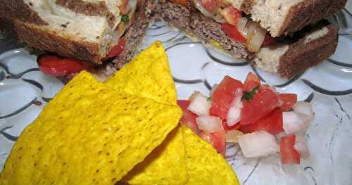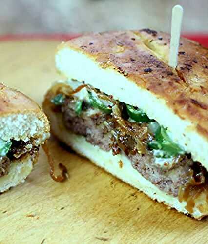 The classic American burger/sandwich hybrid: A beef patty, caramelized onions, and Swiss cheese on toasted sourdough bread.