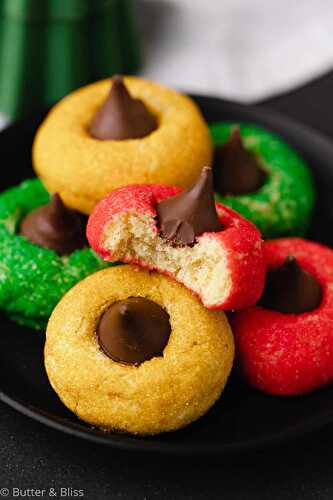 Add a little festive color to your holiday cookie baking with this small batch of Blossom Sparkle Sugar Cookies! Soft and tender vanilla sugar cookies are rolled in colored sprinkles and adorned with a Hershey Kiss to make a delightful batch of holiday.