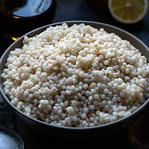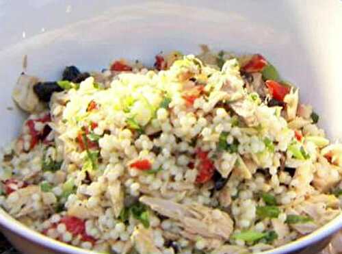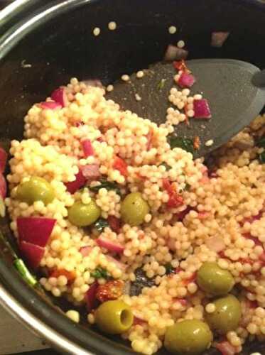 This nice pearl couscous salad recipe features pearl couscous as well as ingredients like sun-dried tomatoes, green olives and onion as well.