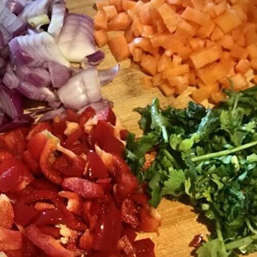 INGRÉDIENTS / INGREDIENTS / INGREDIENTES 200 g de couscous, 250 ml d'eau bouillante, 1 poivron vert, 1 tomate, ½ oignon blanc, ¼.