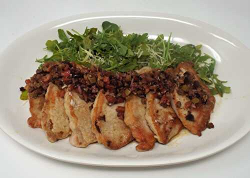 Center cut boneless pork chops are cooked quickly in a pan and topped with a flavorful and easy to make olive relish.